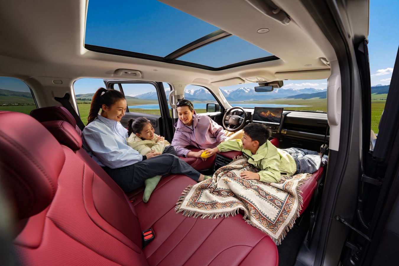 5 座版车型791L 超大后备厢容积,搭配45 处人性化储物空间从容包揽全家所需,玩具、户外帐篷、露营装备皆可分区收纳、整齐规整,告别杂乱拥挤。后排座椅纯平放倒,瞬间变身为宽敞舒适的“移动大床房”,露营休憩、短途午休、临时歇脚主打一个自在惬意。内饰延续高端质感,熔岩红配色搭配软包门护板,触感温润亲肤,让孩子在后排自在玩耍、倚靠、触碰,全程不用担心磕碰受伤,全家出行更舒心。