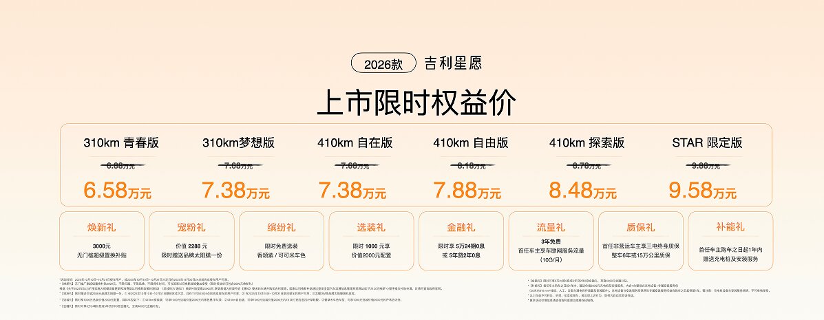 2026款吉利星愿上市限时权益价为6.58万元–9.58万元。同时为回馈用户支持,同步推出八重限时购车权益,包括焕新礼、宠粉礼、缤纷礼、选装礼、金融礼、流量礼、质保礼、补能礼,进一步降低拥车门槛,提升用车体验。