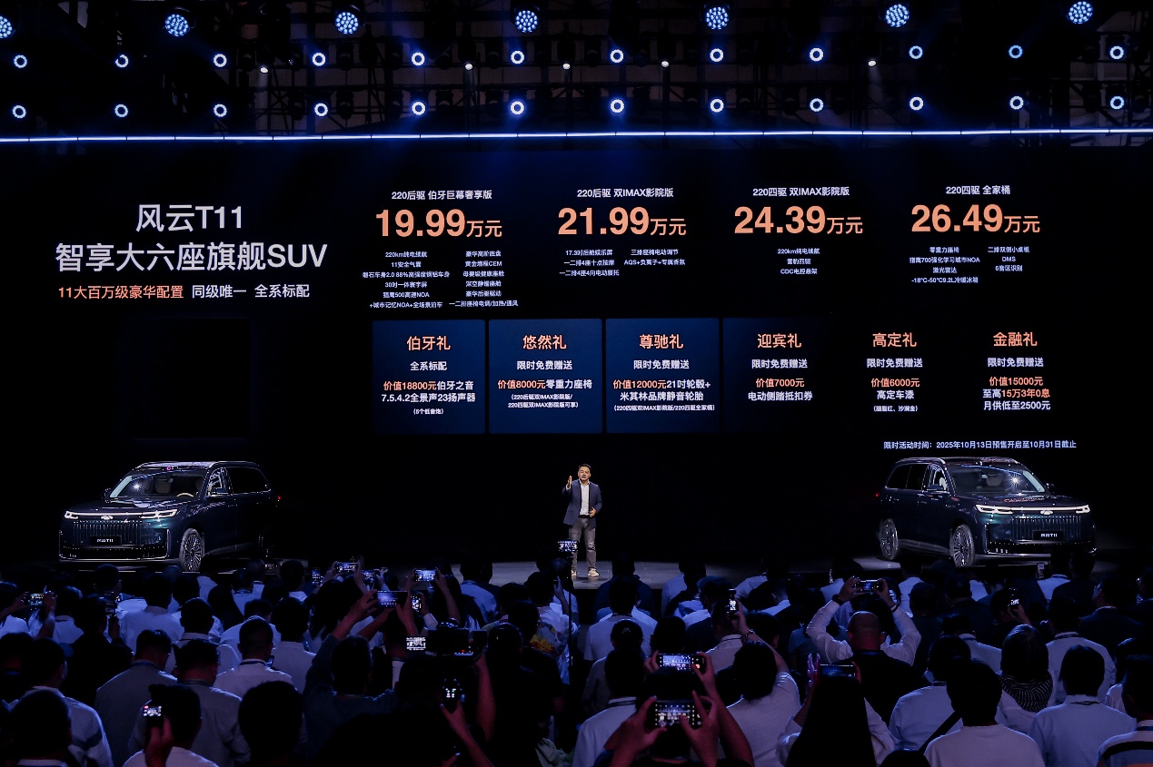 【中国汽车趋势网讯】2025年10月13日,以“兑现”为主题的风云T11家庭品鉴日暨预售发布会在安徽·芜湖隆重圆满收官。作为风云品牌焕新后的首款旗舰级 SUV,风云 T11 定位为 “智享大六座旗舰 SUV”。新车以“顶格对标”为理念,凭借“超大更好”四大核心价值、三大沉浸式场景与11大全系标配,重新定义了家庭出行豪华体验,兑现中国家庭对品质生活的全维期待。