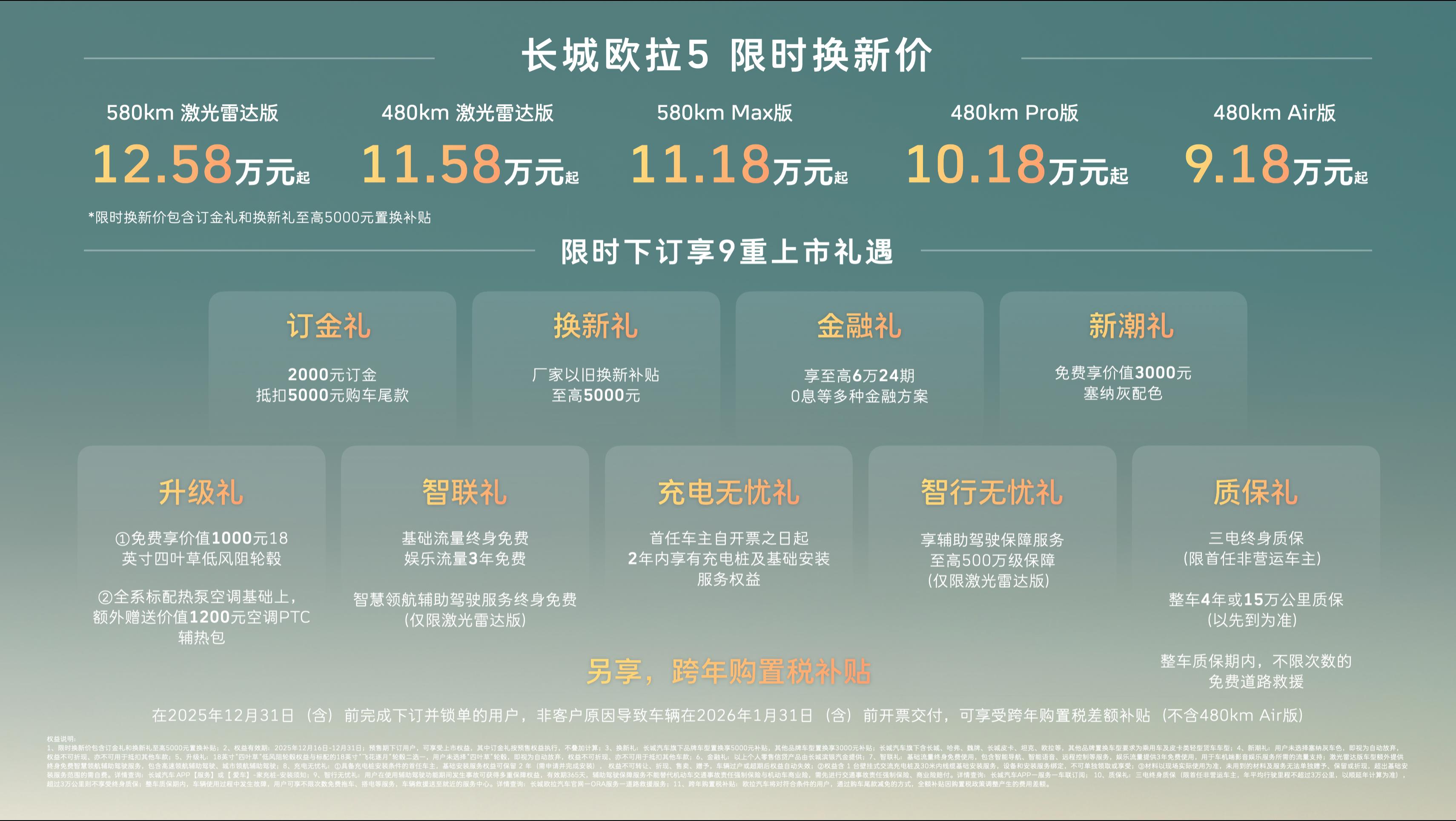 【中国汽车趋势网 12月16日讯】今日,长城汽车欧拉品牌全新A级纯电SUV——长城欧拉5正式上市。新车共推出5款配置,建议零售价区间为 9.98万至13.38万元,限时换新价9.18万元起(限时换新价包含“订金礼”和“换新礼”至高5000元以旧换新补贴)。为回馈广大用户的热爱与支持,即日起至2025年12月31日,用户下订并锁单即可尊享包含订金礼、换新礼、智行无忧礼在内的9重上市好礼,以及跨年购置税补贴(不含480km Air版)等丰厚购车权益。凭借诚意十足的价格权益与越级产品力,长城欧拉5致力于成为全球年轻用户的“严选搭子”。
