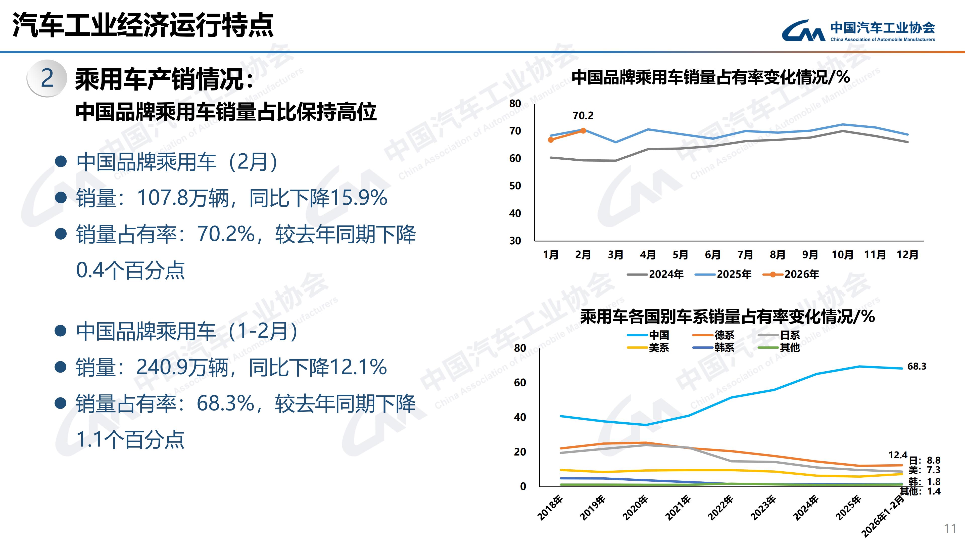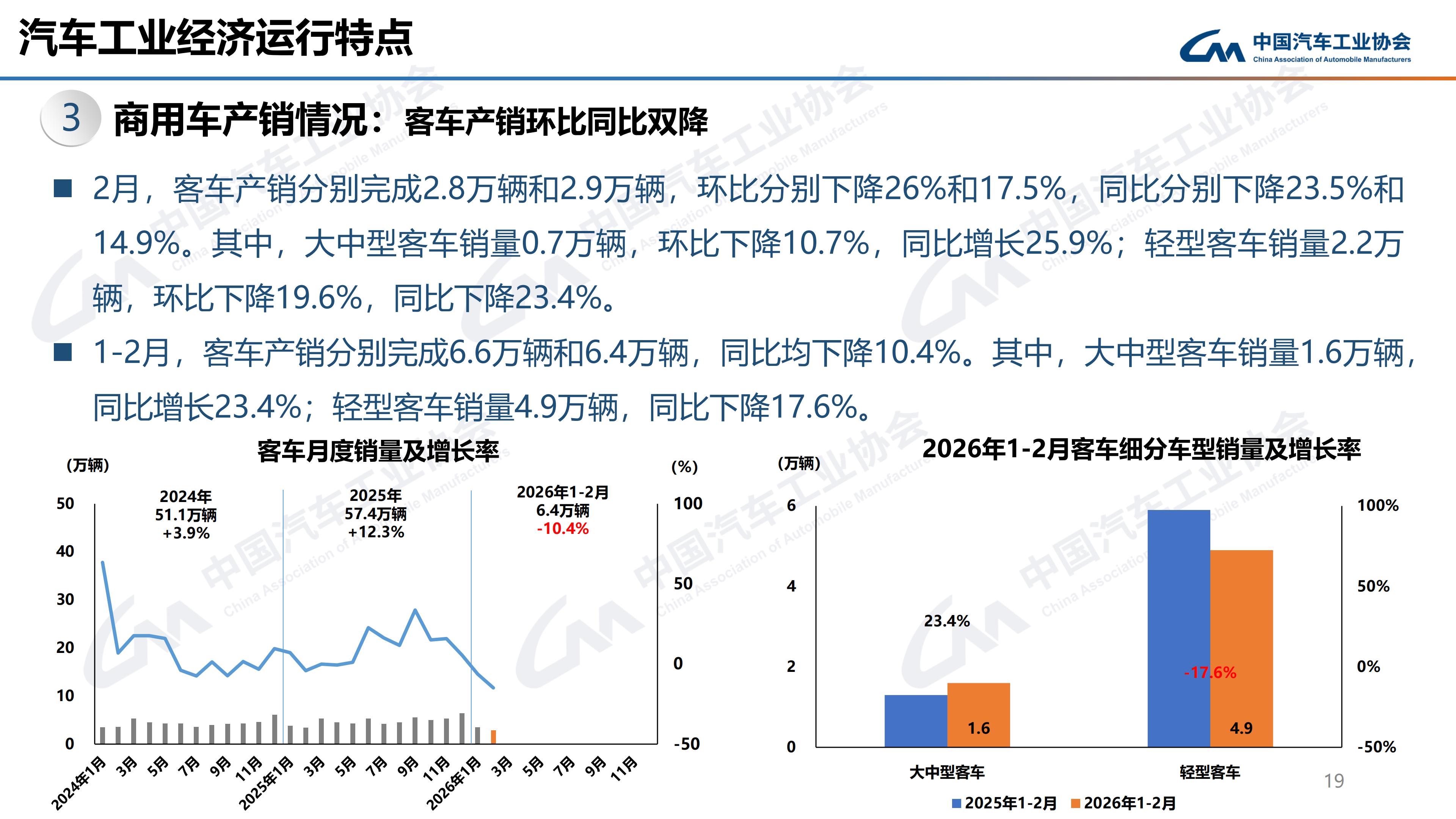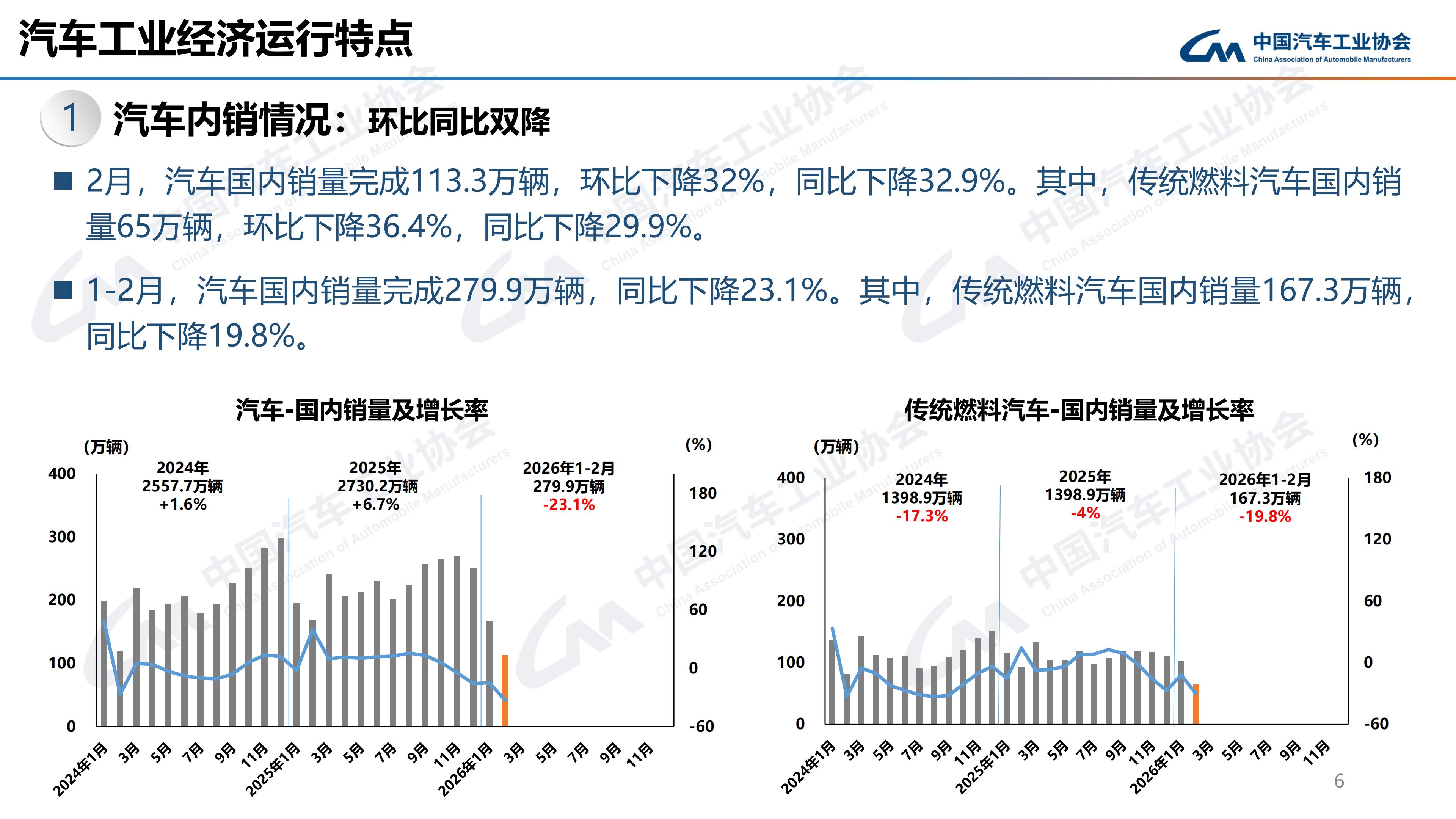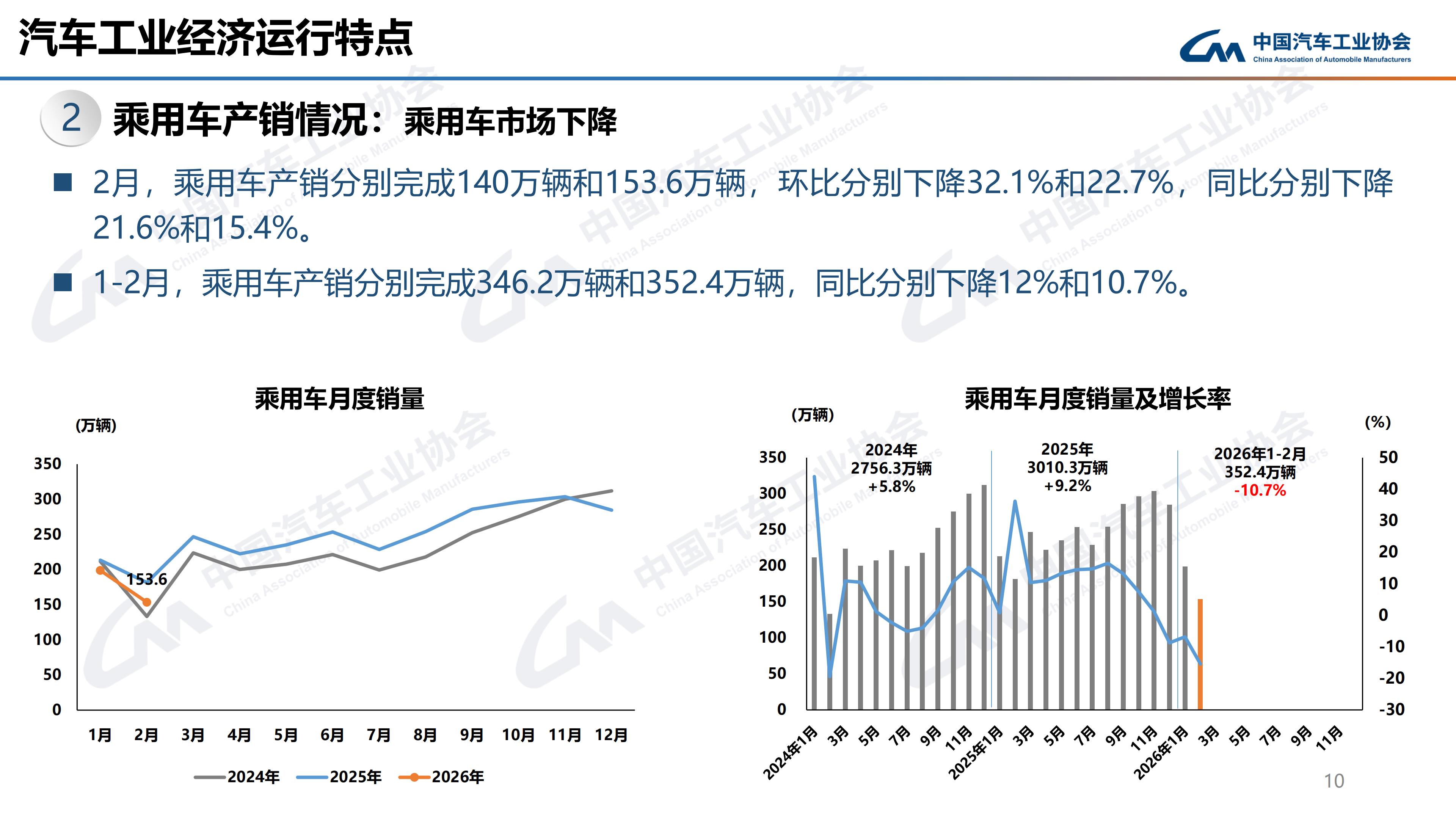 2月,受政策切换调整、部分需求提前示释放、春节假期等多因素影响,乘用车产销环比、同比均呈下降。