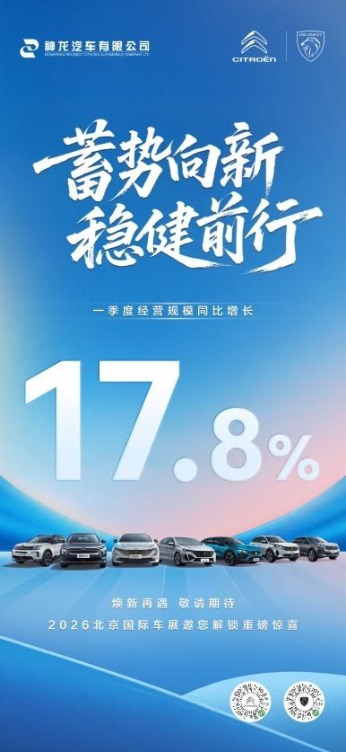 【中国汽车趋势网 4月1日讯】2026年是“神龙复兴三年行动”的开局之年。一季度,神龙汽车有限公司在去年经营持续向好的基础上,以“蓄势向新,稳健前行”的姿态,交出了一份扎实的开门红答卷——经营规模同比增长17.8%,为实现2026年全年目标打下坚实基础。这份成绩的背后,是神龙汽车团队抢时间、抢市场、抢订单的拼搏身影,也是双品牌坚决贯彻“在中国 为全球”战略,围绕“经营+项目”双主线全力推进的生动体现。在即将到来的2026北京国际车展,神龙汽车旗下东风标致、东风雪铁龙品牌焕新再遇,以全新面貌解锁品牌发展的又一重要篇章。