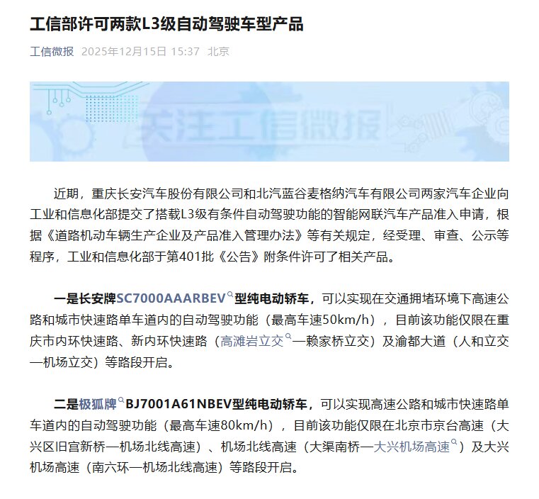 12月15日,工信部装备工业一司发布公告称:重庆长安汽车股份有限公司和北汽蓝谷麦格纳汽车有限公司两家汽车企业向我部提交了搭载L3级有条件自动驾驶功能的智能网联汽车产品准入申请,根据《道路机动车辆生产企业及产品准入管理办法》等有关规定,经受理、审查、公示等程序,我部于第401批《公告》附条件许可了相关产品。