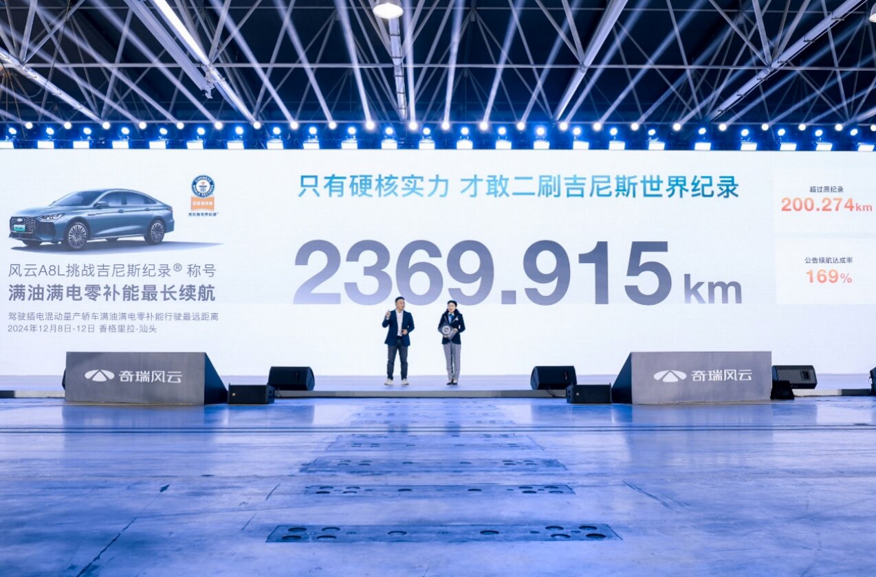 最终,奇瑞风云A8L以2369.915公里的成绩打破吉尼斯记录,彰显了中国新能源汽车产业在全球舞台上的标杆地位。这不仅是一次对风云A8L续航能力的极限考验,对奇瑞混动技术的一次全面检验,更向用户展示了这个时代最好的混动的硬核实力。