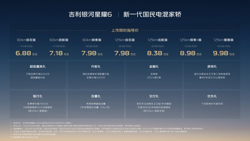 10月30日,吉利银河旗下新一代国民电混家轿——银河星耀6全球正式上市。新车共推出7个版型,覆盖60km/125km两种纯电续航,限时指导价仅6.88-9.98万元,叠加“11月30日前下订享6000元置换金+7重购车权益”的福利,直接拉低高品质电混家轿的入手门槛。
