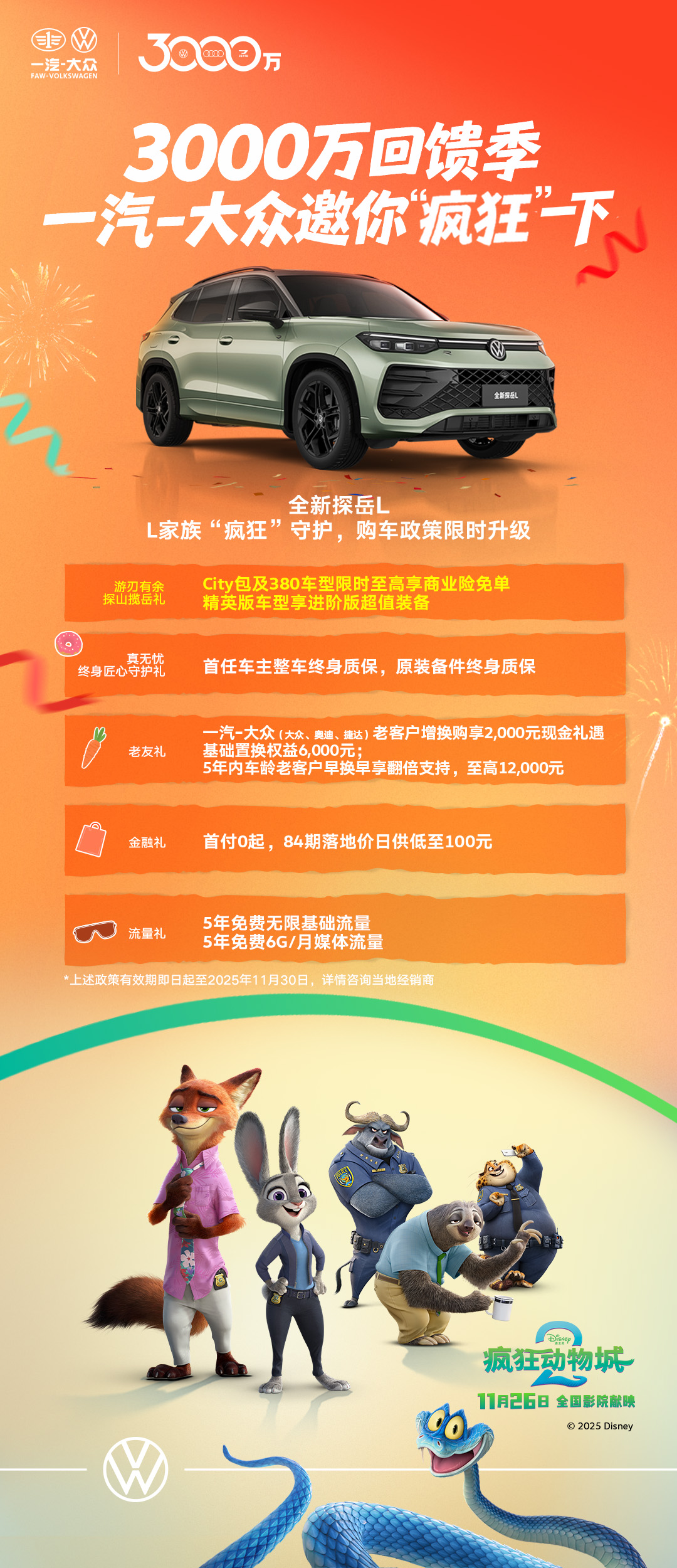 在达成3000万辆这一具有里程碑意义的重要节点上,一汽-大众继续践行着以客户为中心的长期主义和利他主义,以切实行动真诚回馈新朋老友。继推出“新车免费开一年”感恩权益,以及为多位忠诚老友免费置换新车后,一汽-大众再次推出新的权益回馈,针对新朋老友的集结礼和L家族“守护礼”,包含“双终身”质保、增换购现金礼等丰富权益,将企业发展的里程碑转化成实实在在的客户权益,进一步强化品牌与客户之间的情感纽带。