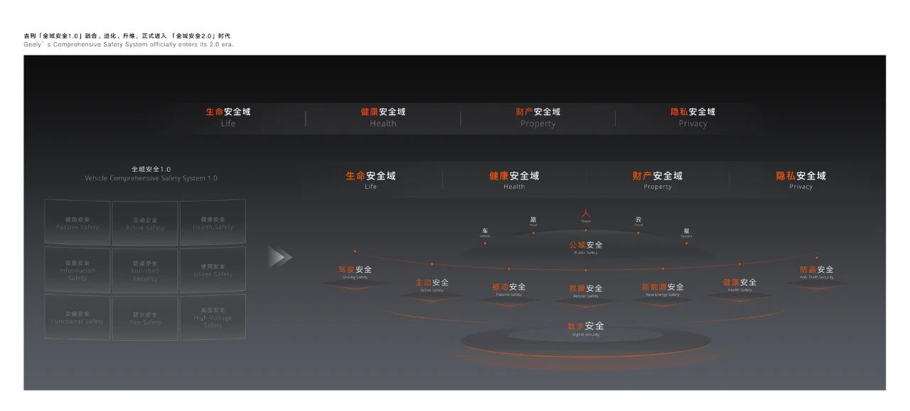 作为行业安全技术的先行者与引领者,吉利在“全域AI”技术体系的赋能下,以“AI为纲 责任为本”,基于原有的“全域安全”技术体系进阶打造“全域安全2.0”技术体系。结合智能时代的安全新需求和新挑战,“全域安全2.0”技术体系秉持“以人为尊”理念,通过技术升级、能力突破与范式创新,将侧重“整车安全”的视角升级为“人-车-路-云-星”的生态视角,旨在贯穿用户出行全场景、覆盖出行全领域、联动出行全生态;并以“生命零伤亡、健康零危害、财产零损失、隐私零泄露”四大安全愿景为指引,逐步构建的一套为消费者提供全面的安全保障技术体系。