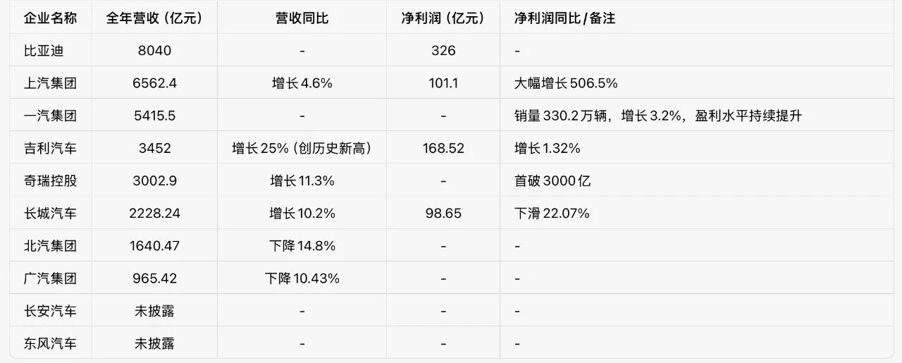 2025年国内主流车企业绩表(截至4月2日按营收从高到低排序)