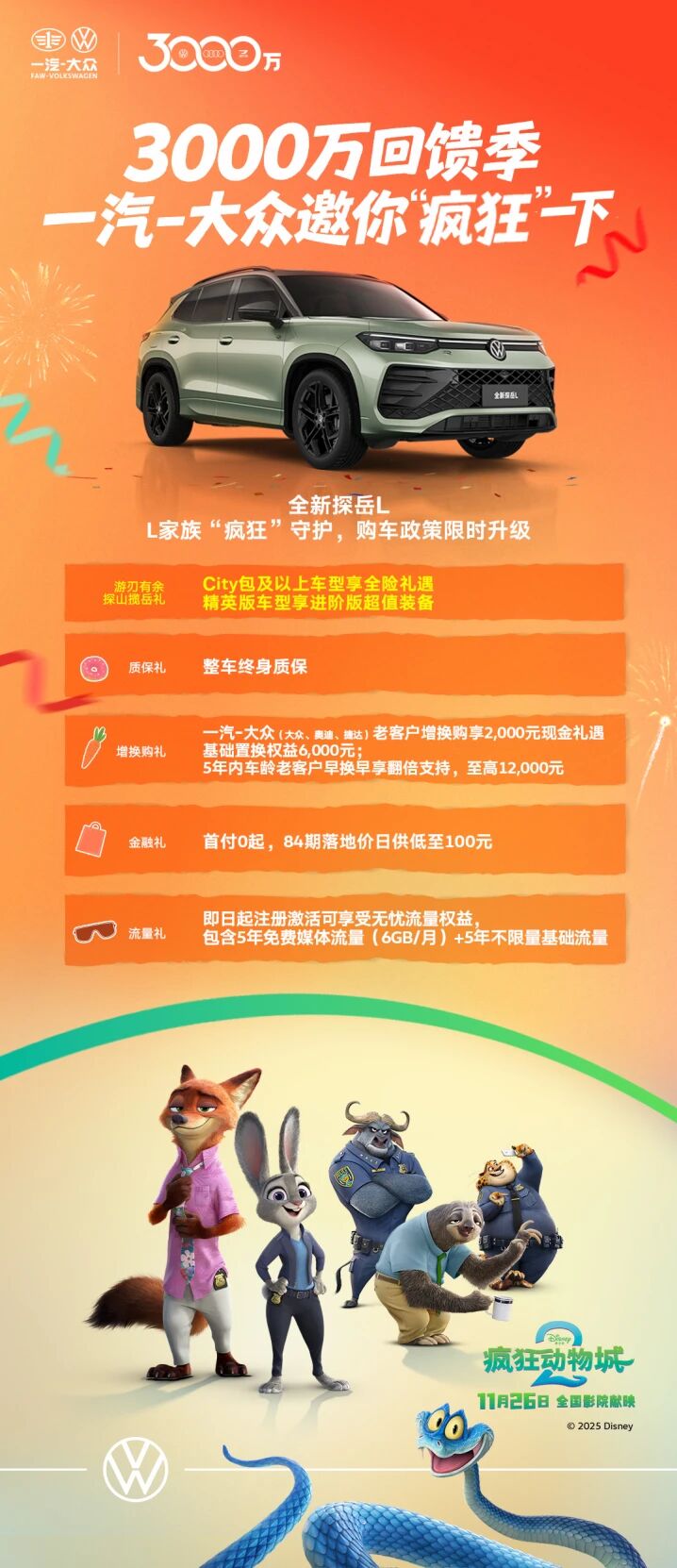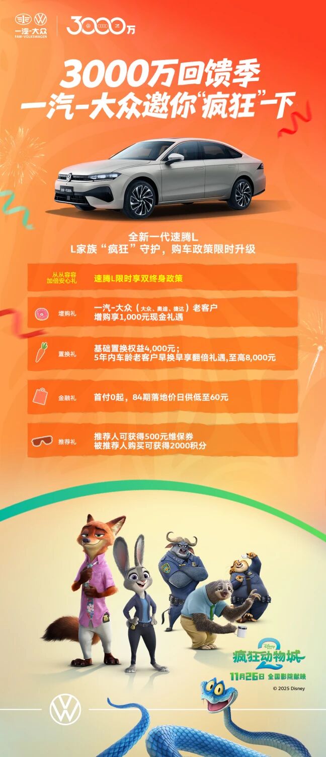 在达成3000万辆这一具有里程碑意义的重要节点上,一汽-大众继续践行着以客户为中心的长期主义和利他主义,以切实行动真诚回馈新朋老友。继推出“新车免费开一年”感恩权益,以及为多位忠诚老友免费置换新车后,一汽-大众再次推出新的权益回馈,针对新朋老友的集结礼和L家族“守护礼”,包含“双终身”质保、增换购现金礼等丰富权益,将企业发展的里程碑转化成实实在在的客户权益,进一步强化品牌与客户之间的情感纽带。